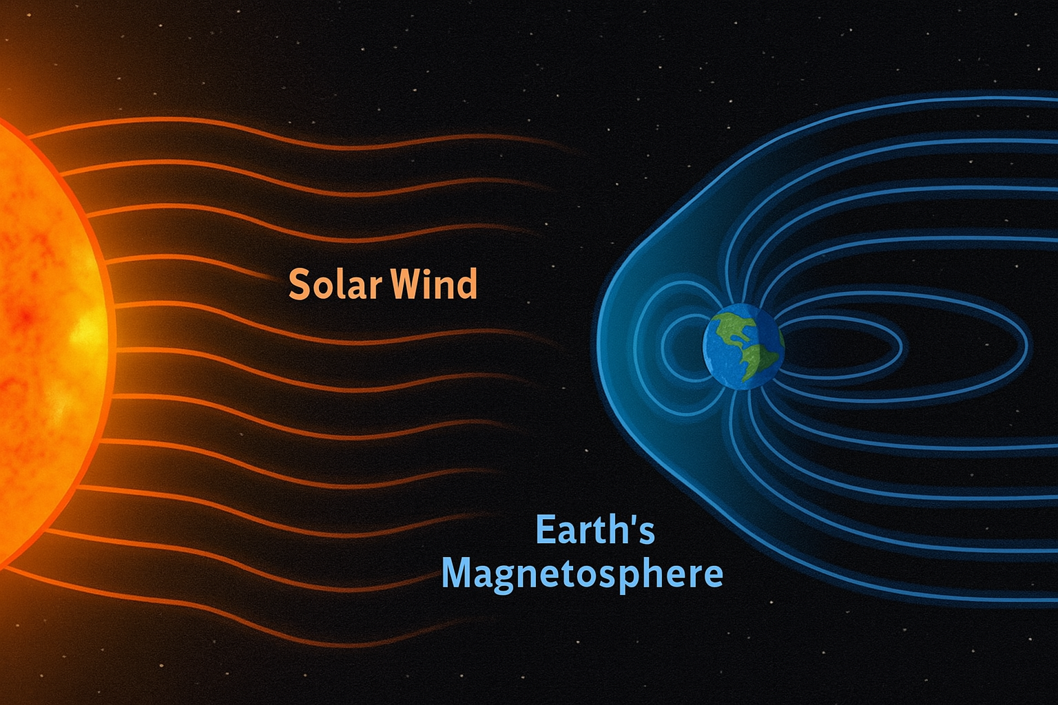 액체 철과 니켈로 이루어진 지구의 핵이 회전하며 거대한 자석처럼 자기장을 만들고, 이 자기장은 태양에서 날아오는 치명적인 방사선과 입자, 즉 태양풍으로부터 지구 표면을 지킵니다.